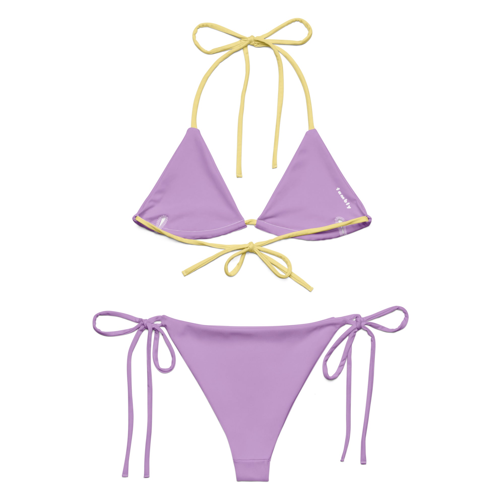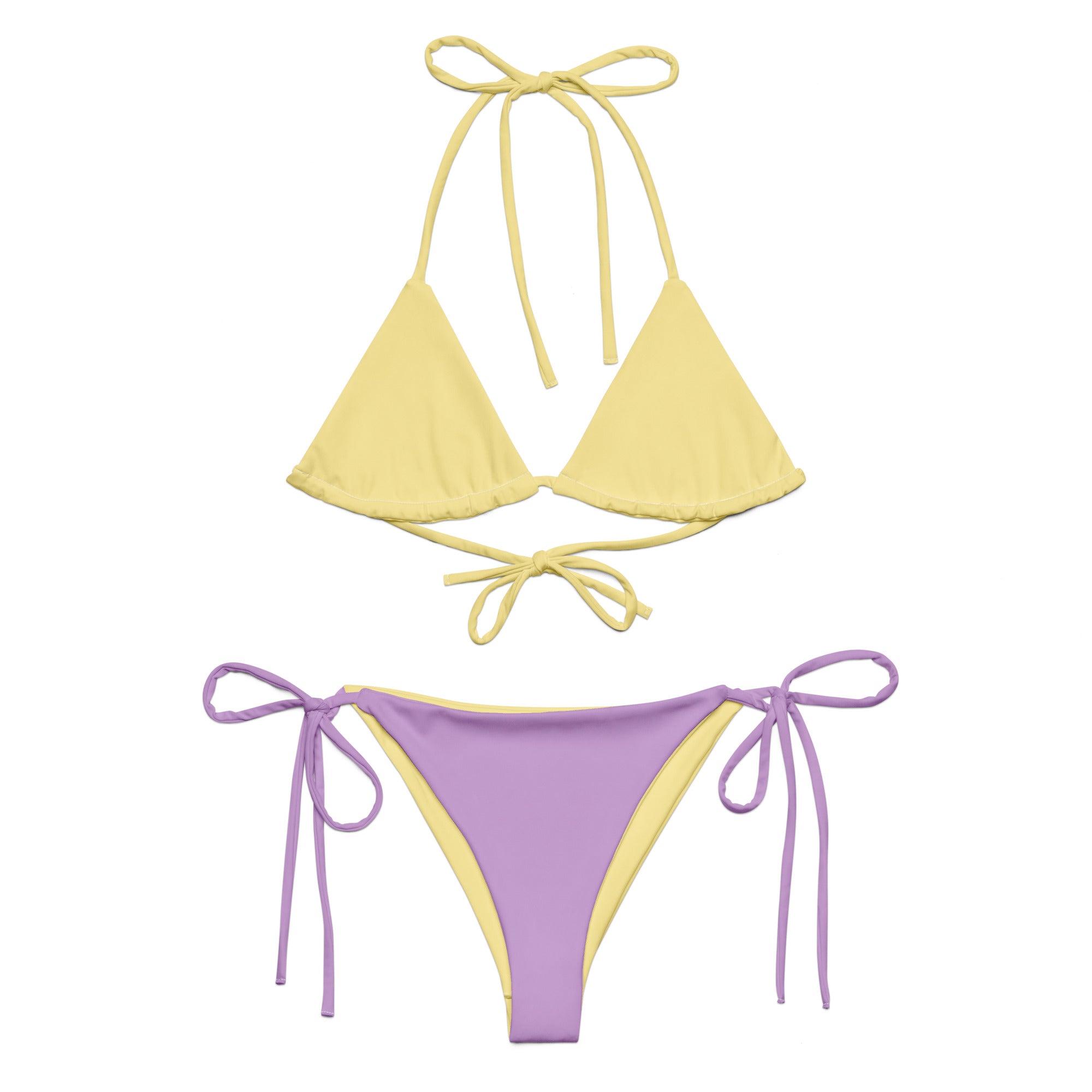 Own the sunshine in this bold and vibrant string bikini, designed for moms who love color, confidence, and a little fun in the sun. With a playful mix of sea yellow and soft purple tones, this bikini set brings serious summer energy while keeping comfort in check. The adjustable triangle top and classic tie-side bottoms offer a customizable fit that flatters every shape — perfect for tanning, swimming, or chasing little ones on the shore.