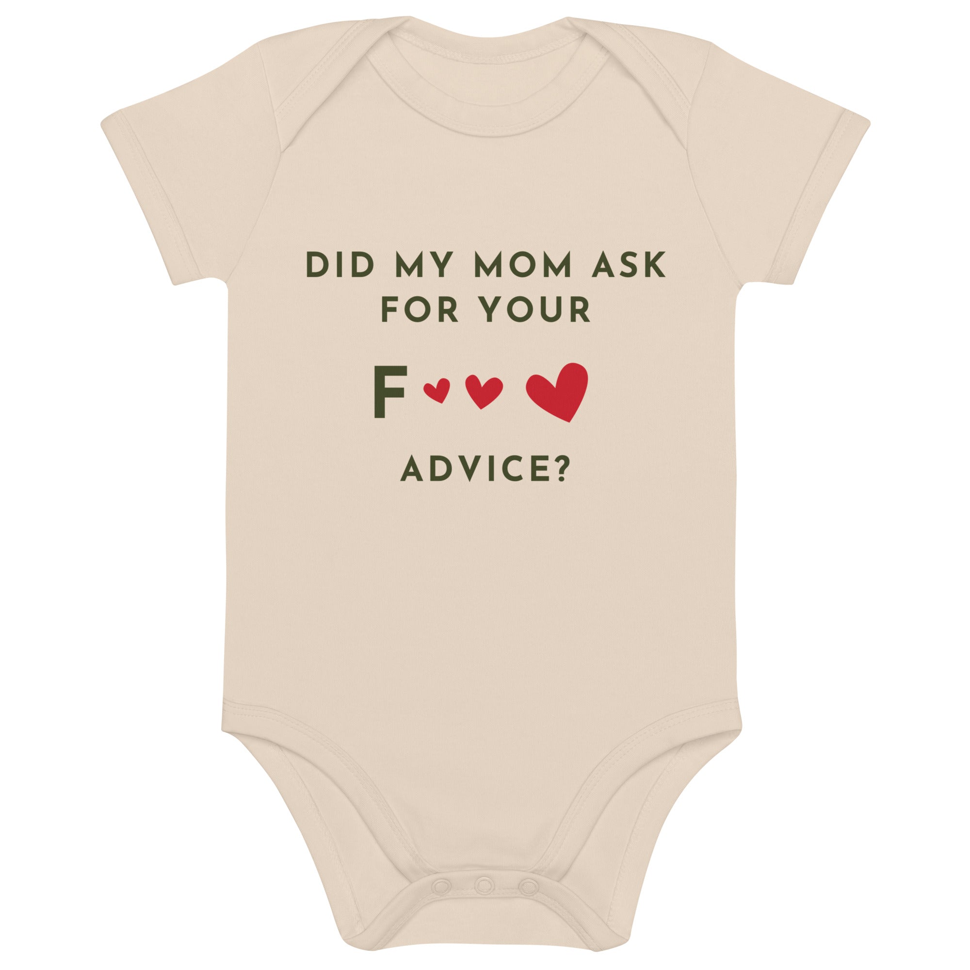 Here’s the Frankly Romper for the bold and brilliant little one in your life! This cheeky beige romper has a message that’s both witty and relatable: “Did My Mom Ask for Your F** Advice?” with heart icons adding a bit of playful charm. Perfect for parents who embrace a bit of sass with style, this romper is crafted for comfort and laughs, featuring ultra-soft cotton that keeps your baby snug while letting their personality shine.